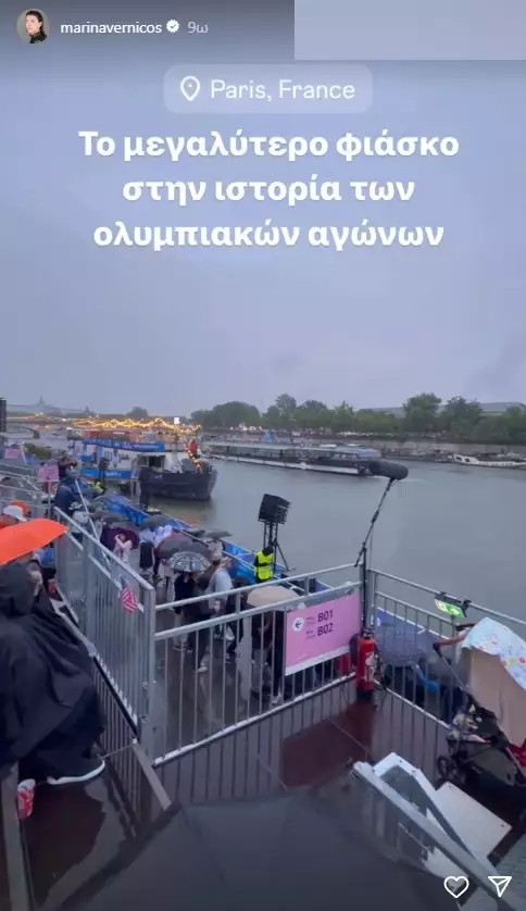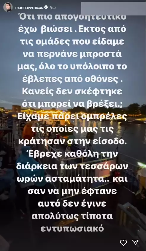 Στη συνέχεια, η Μαρίνα Βερνίκου ξέσπασε γράφοντας τα εξής: «Ό,τι πιο απογοητευτικό έχω βιώσει. Εκτός από τις ομάδες που είδαμε να περνάνε μπροστά μας, όλο το υπόλοιπο το έβλεπες από οθόνες. Κανείς δεν σκέφτηκε ότι μπορεί να βρέξει; Είχαμε πάρει ομπρέλες τις οποίες μας κράτησαν στην είσοδο. Έβρεχε καθ’ όλη τη διάρκεια των τεσσάρων ωρών ασταμάτητα… και σαν να μην έφτανε αυτό, δεν έγινε απολύτως τίποτα εντυπωσιακό»