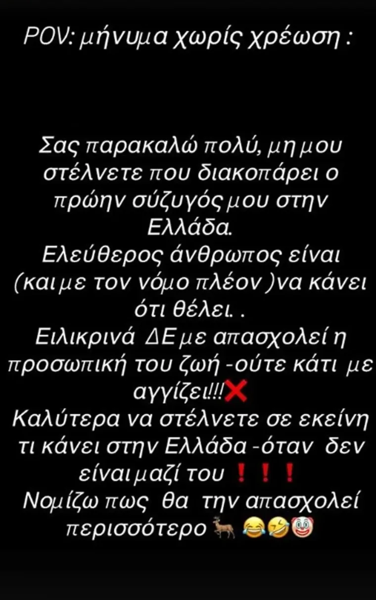 Οι διαδικτυακοί της φίλοι της στέλνουν μηνύματα και την ενημερώνουν τι κάνει ο Παναγιώτης Τατσίδης και πώς περνάει τις διακοπές του και εκείνη θέλησε να δώσει την απάντησή της, μέσα από τον προσωπικό της λογαριασμό στο Instagram, η οποία ήταν άκρως… καυστική!